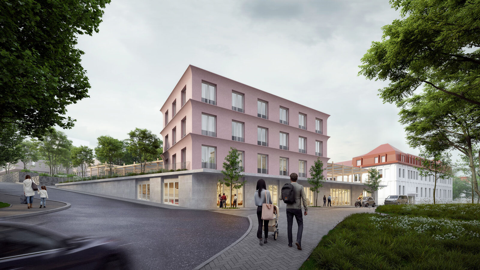 Zelený rajský dvůr na střeše platformy vymezuje dřevěná pergola po jejím obvodu, která bude v rámci stavby další etapy odstraněna a chráněný venkovní prostor budou vymezovat přímo stavební objemy na platformě. Pergola zastřešuje parkovací stání pro 30 osobních aut a pěší promenádu s venkovním wc a malým zázemím pro hosty v případě pořádání malých akcí pro veřejnost. Pěší promenáda má přímou vazbu na společenskou místnost ve 2.NP. Pergola je od ulice Truhlářská odcloněna zelení na střeše platformy a od chodníku směrem k obchodnímu centru sítí s popínavou zelení. Uprostřed rajského dvora se nachází luční zeleň s cestičkou z kamenných šlapáků mezi dvěma kopečky, lavičkami a s přiměřeně vzrostlými stromy, které tvoří příjemné pobytové prostředí.